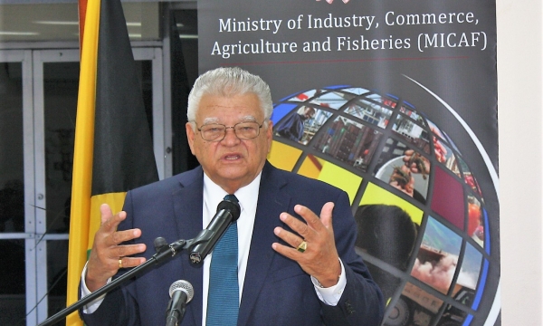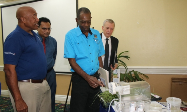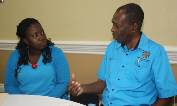 Minister of Industry, Commerce, Agriculture and Fisheries, Hon. Karl Samuda (right), listening intently to Board Chairman, Jamaica Cane Products Sales (JCPS), Karl James (left), during a media briefing to update the country on the scrap metal industry, motor vehicle pre-shipment regime and the refined sugar regime, at the Ministry of Industry, Commerce, Agriculture and Fisheries’ (MICAF) New Kingston offices, on Tuesday, January 23, 2018. Others (l-r) are Chief Technical Director, Andrene Collings and Permanent Secretary, Donovan Stanberry, MICAF.