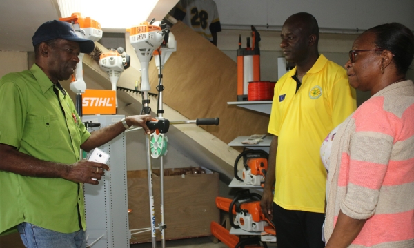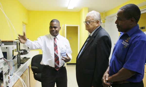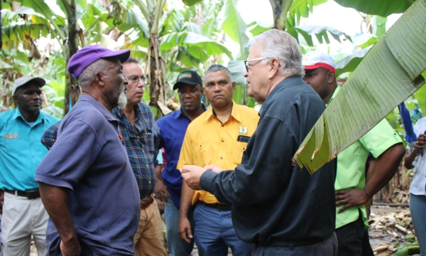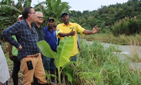 Oral Lewis (right), of The Banana Board, explains the impact of the Swift River on banana farms at Canewood in Portland to (from left) Member of Parliament for West Portland Daryl Vaz, the Hon Karl Samuda, Minister of Industry, Commerce, Agriculture and Fisheries, and Peter Thompson, Chief Executive Officer, Rural Agricultural Development Authority, during a tour of flood-ravaged farms in Portland on February 1.