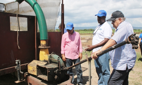 Hon Karl Samuda (2nd right), Minister of Industry, Commerce, Agriculture and Fisheries, greets dairy farmer Derrick Walker, following handover of fertilizers donated by the Jamaica Dairy Development Board (JDDB) at a function held in Rhymesbury, Clarendon, on February 16. Valued at $30m, the fertilizers were specially blended by Newport-Fersan for the development of pasture. Others from left are Donald Elvey, chairman of JDDB, and Dennis Valdez, managing director, Newport-Fersan.