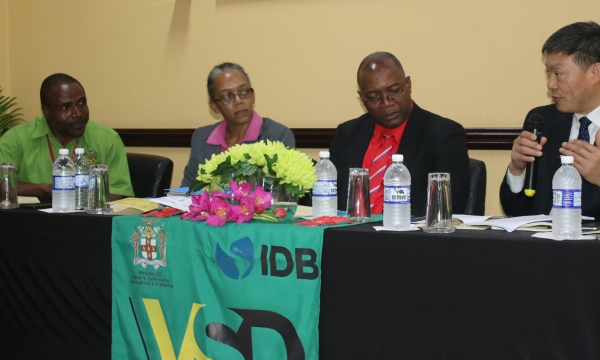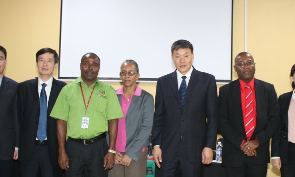 Dr. Osbil Watson (3rd left), Chief Veterinary Officer, and Avery Smikle, Acting Director of Fisheries, both from the Ministry of Industry, Commerce, Agriculture and Fisheries; and Esmond Reid (3rd right), Acting Undersecretary at the Ministry of Foreign Affairs and Foreign Trade, pose with Ning Wang(4th right), Director of Food Safety Division 4, Import and Export Food Safety Bureau, Administration of Quality Supervision, Inspection and Quarantine in China, and other members of an audit team from China at a meeting held at the Ministry’s Veterinary Services Division offices in St. Andrew...