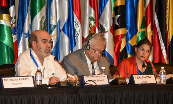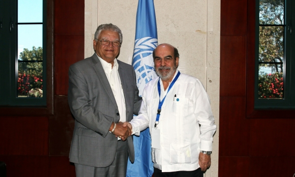 Minister of Industry, Commerce, Agriculture and Fisheries, the Hon Karl Samuda (left) greets Director General of the Food and Agriculture Organization (FAO) on Tuesday, March 6, 2018 on day two of the 35th Session of the FAO Regional Conference for Latin America and the Caribbean being held at the Montego Bay Convention Centre, Rose Hall, Montego Bay. All 33 Member States are in attendance at the Conference which is examining the central themes of Zero Hunger, Obesity and Rural Development.