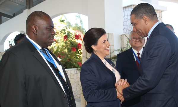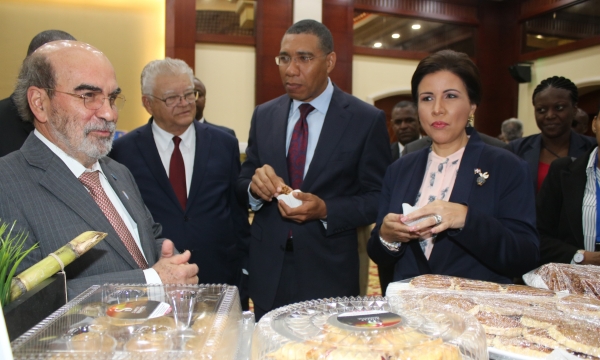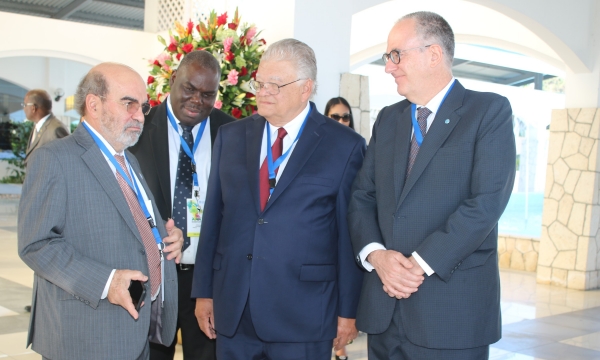 Dr José Graziano da Silva (left), Director General, Food & Agriculture Organization of the United Nations, in discussion with (from left) Permanent Secretary in the Ministry of Industry, Commerce, Agriculture and Fisheries, Donovan Stanberry, Hon Karl Samuda, Minister of Industry, Commerce, Agriculture and Fisheries, and Assistant Director General for FAO Latin America and Caribbean Region, Dr Julio Berdegué, at the Opening Ceremony of the 35th Session of the FAO Regional Conference for Latin America and the Caribbean, held at the Montego Bay Convention Centre in Rose Hall, St. James,...