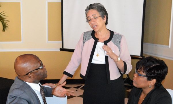 Chief Technical Director in the Ministry of Industry, Commerce, Agriculture and Fisheries, Andrene Collings (centre), converses with Quality Infrastructure Coordinator, Junior Gordon; and Chief Executive Officer, National Compliance and Regulatory Authority, Lorice Edwards-Brown, at the National Quality Policy Final Validation Workshop, held at the Terra Nova Hotel, Waterloo Road, on Tuesday, March 6, 2018.