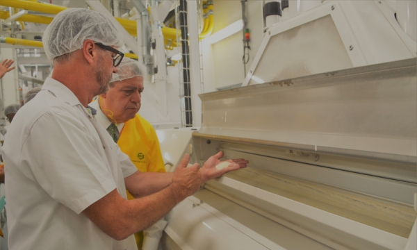 General Manager, Jamaica Grain and Cereals Limited, Seprod Group, Jeffrey Moss-Solomon (right), discusses cornmeal and cornmeal products with Minister of Industry, Commerce, Agriculture and Fisheries, Hon. Audley Shaw, during a tour of the company’s facility, located on Felix Fox Boulevard, Kingston, on Wednesday, April 19, 2018.
