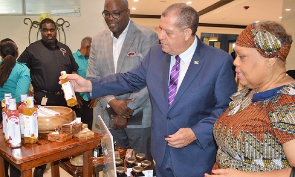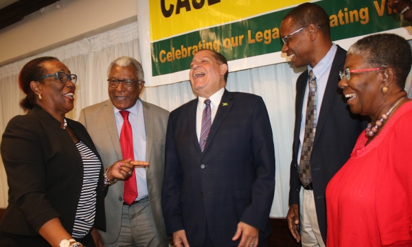 Hon Audley Shaw (3rd left), Minister of Industry, Commerce, Agriculture and Fisheries, poses with participants in the CASE Alumni Association’s Panel Discussion held at the Jamaica Pegasus in Kingston on May 17 under the theme ‘Jamaica’s National Food Security & the Vulnerability of Local Food Supplies to External Economic Shocks’. From left are Una May Gordon, Principal Director in the Ministry of Economic Growth & Job Creation; Canute Saddler, Managing Director, Stanmark Food Processors; Alexi Reid, 3rd Vice-President, CASE Alumni Association; Sylburn Thomas, CEO, Agro-Invest...