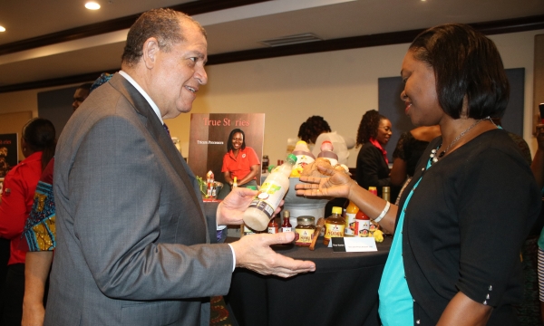Hon Audley Shaw, Minister of Industry, Commerce, Agriculture and Fisheries, presents a copy of the of the 2nd edition of True Stories: From Farm to Fork, a publication chronicling the journey of 29 small manufacturers and enterprises in the agri-based sector, to Beverley Lashley, National Librarian, at the launch of the magazine on May 15 at the Jamaica Pegasus hotel in Kingston. At left is Valerie Veira, Chief Executive Officer of the Jamaica Business Development Corporation.