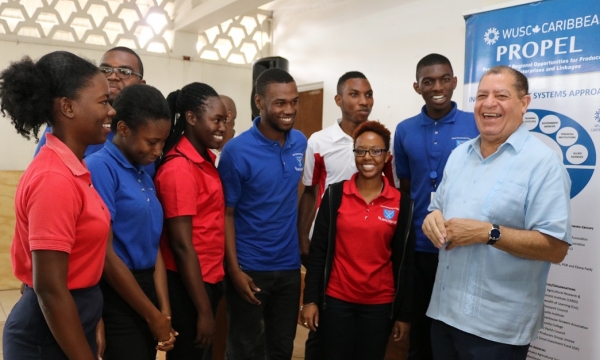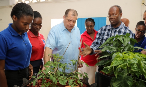 Hon. Audley Shaw (left), Minister of Industry, Commerce, Agriculture and Fisheries, views Irish potato sucker while Alvin Murray (2nd left), Project Coordinator, World University Service of Canada Caribbean PROPEL, explains tissue culture technology used to develop plant. Others from left are Donald Robinson, Agricultural Extension Facilitator, Promotion of Regional Opportunities for Produce through Enterprises and Linkages (PROPEL), and Dr. Sherrefa Burchell, Director, Agriculture Research Centre at the Northern Caribbean University. The occasion was the Youth Employment Creation in...