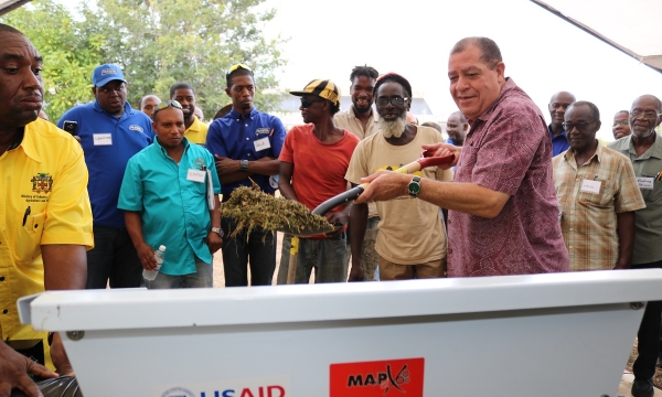 From left, Hon Audley Shaw, Minister of Industry, Commerce, Agriculture and Fisheries, Member of Parliament for Clarendon South Eastern, Hon. Rudyard Spencer; Hon Karl Samuda, Minister without Portfolio in the Ministry of Economic Growth and Job Creation, Board Chairman, National Housing Trust, Lennox Channer; and Director, SCJ Holdings Limited (SCJH), Horace Charoo, in discussion at the groundbreaking ceremony for the development of 84 serviced lots at Monymusk Glades in Clarendon on September 12.