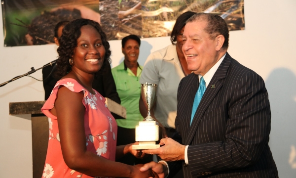 Hon Audley Shaw, Minister of Industry, Commerce, Agriculture and Fisheries, presents trophy to the best female cane farmer Kenesha Gordon from Dukenfield, St. Thomas, at the All-Island Jamaica Cane Farmers’ Association 69th Annual General Meeting, held at the Spanish Court Hotel in New Kingston on November 14, 2018.