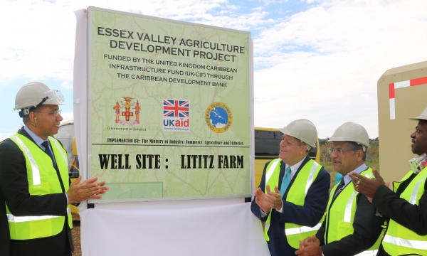 The Most Hon. Andrew Holness, Prime Minister of Jamaica, operates drill equipment at the Lititz Farm Well Site in St. Elizabeth at the launch of the Essex Valley Agriculture Development Project on January 16, 2019. Looking on is the Hon Audley Shaw (2nd left), Minister of Industry, Commerce, Agriculture and Fisheries, and Dermon Spence (left), Acting Permanent Secretary in the Ministry of Industry, Commerce, Agriculture and Fisheries. The £35,515-million Essex Valley Agriculture Development Project is funded through a grant from the United Kingdom Caribbean Infrastructure Partnership Fund...