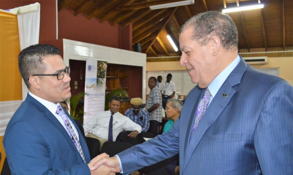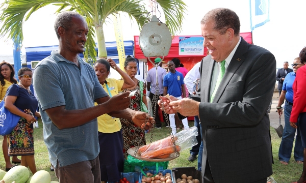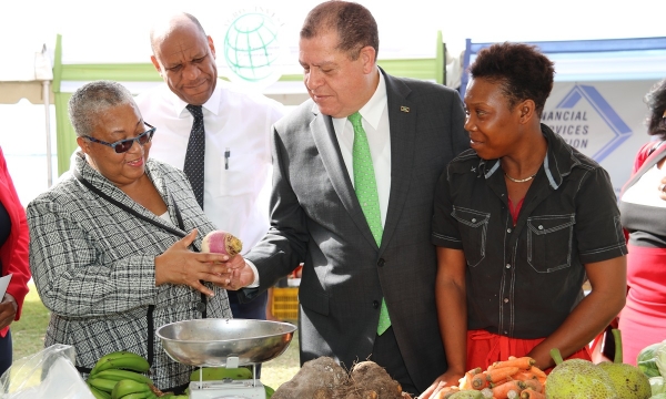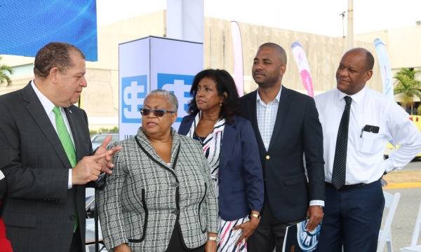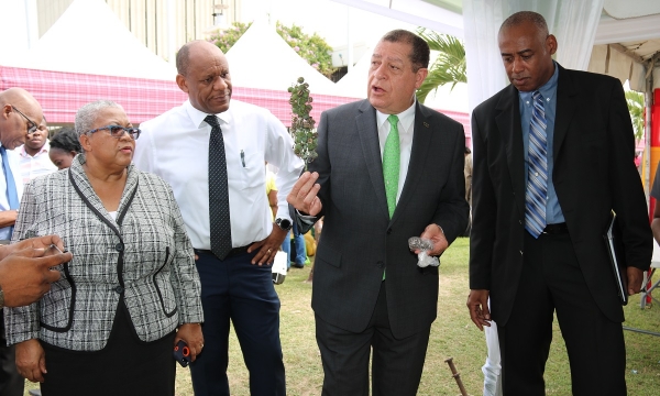 Hon Audley Shaw (left), Minister of Industry, Commerce, Agriculture and Fisheries, in discussion with (from left) Marlene Street-Forrest, Managing Director at the Jamaica Stock Exchange (JSE), Antoinette McKain, Chief Executive Officer, Jamaica Deposit Insurance Corporation, Steven Gooden, CEO, NCB Capital Markets and Ian McNaughton, chairman, JSE, at the JSE’s Market Meets the Market by the Sea at the waterfront in downtown Kingston on February 7, 2019, one of the events marking the 50th Anniversary of the JSE.