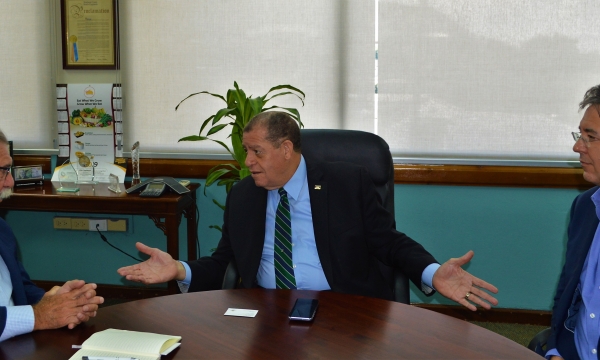 Minister of Industry, Commerce, Agriculture and Fisheries, the Hon. Audley Shaw (centre), along with Executive Director, Canadian Consortium for Investigation of Cannabis, Dwight Moore (right); and Director, International Business Development Caribbean Region, Steve Baker, during a courtesy call at his New Kingston offices on Wednesday, February 20, 2019. Among the matters discussed was the Ministry’s commitment to facilitate further development of the medical marijuana industry in Jamaica.
