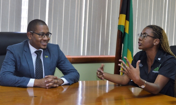 Minister of State in the Ministry of Industry, Commerce, Agriculture and Fisheries, Hon. Floyd Green (left), in dialogue with president of the University of the West Indies (UWI, Mona) Students Today Alumni Tomorrow (STAT) Vice Chancellor’s Ambassador Corps, Giselle Campbell, during a courtesy call at the Ministry’s New Kingston offices, on Tuesday, February 26, 2019. Among the matters discussed were youth in agriculture and the business environment in Jamaica. Minister Green gave the students an overview of his role as Minister of State. The visit was a part of UWI STAT Week from February...