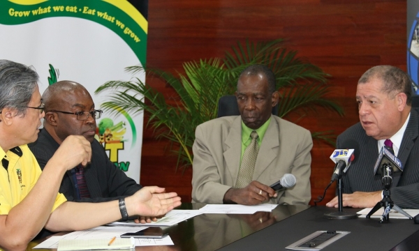 Andre Kong (left), Director of Fisheries in the Fisheries Division of the Ministry of Industry, Commerce, Agriculture and Fisheries (MICAF), speaking at a media briefing on the conch industry at the Ministry’s Hope Gardens offices in St. Andrew on March 12, 2019. Others from right are the Hon Audley Shaw, Minister of Industry, Commerce, Agriculture and Fisheries, Hon J.C. Hutchinson, Minister without Portfolio, MICAF and Dermon Spence, Acting Permanent Secretary, MICAF.