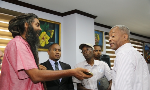 Sean Francis (left) of B&D Trawling Ltd in discussion with (from left) Minister of State in the Ministry of Industry, Commerce, Agriculture and Fisheries, Hon Floyd Green, Mr. Sydney Francis, Managing Director, Ton-Rick Enterprises Limited and Jerome Miles, General Manager, Rainforest Seafoods Ltd, at a media briefing on the conch industry at the Ministry’s Hope Gardens offices in St. Andrew on March 12, 2019.