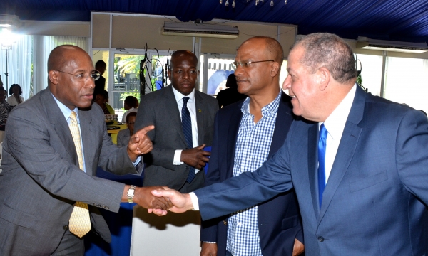 Minister of Industry, Commerce, Agriculture and Fisheries, Hon. Audley Shaw (right), greets Chief Executive Officer, Corporate Strategies Limited, Senator Aubyn Hill (left), at the Planning Institute of Jamaica’s ((PIOJ) Inaugural Economic Growth Forum at the Terra Nova All-Suites Hotel, on Thursday, March 14, 2019. Others (from left) are Minister of State in the Ministry of Foreign Affairs and Foreign Trade, Hon. Pearnel Charles Jr; and Member of Parliament for Central Manchester, Peter Bunting. The PIOJ Growth Inducement Programme hosted its Forum under the theme ‘From Elusive to Inclusive Growth’.