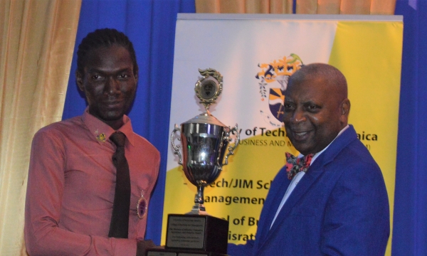 Director, Projects and Programmes, MSME Division, Ministry of Industry, Commerce, Agriculture and Fisheries (MICAF), Clifford Spencer (right), along with student of University of Technology Jamaica (UTech), Christopher Wright, poses with awards received from the MICAF, at the institution’s Annual Awards Banquet, at the Spanish Court Hotel, Worthington Terrace, on March 29, 2019. Mr. Wright was the first recipient to receive the MICAF awards for outstanding achievement in Academics, Leadership and Service. The ceremony was held under the theme ‘Driving Business Growth and Development...