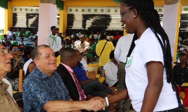 Hon Audley Shaw, Minister of Industry, Commerce, Agriculture and Fisheries, greets Shanese Phoenix, Barbados 4-H Ambassador 2019, at the Jamaica 4-H Clubs National Achievement Day Expo, held at the Denbigh Showground in Clarendon on April 5, 2019.