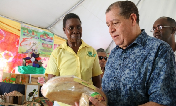 Hon Audley Shaw, Minister of Industry, Commerce, Agriculture and Fisheries, views whole wheat bread made by members of the St. Catherine Adult Correctional Centre 4-H Club during a tour of the St. Catherine 4-H Clubs display at the Jamaica 4-H Clubs National Achievement Day Expo, held at the Denbigh Showground in Clarendon on April 5, 2019. At left is Elaine Campbell, Parish Manager, Jamaica 4-H Clubs, and in the background is Executive Director of the Jamaica 4-H Clubs, Dr. Ronald Blake.