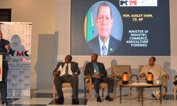Minister of Industry, Commerce, Agriculture and Fisheries, Hon. Audley Shaw, speaking at the 10th Anniversary Middle Managers’ Conference, at The Jamaica Pegasus hotel on Tuesday, May 7, 2019. Seated from left are Director, Make Your Make Consultants (MYMC), Major Evon Lloyd; Pastor, Transformed Life Church, Reverend Dwight Fletcher; Managing Director, MYMC, Jacqueline Coke-Lloyd; and President, Jamaica Manufacturers and Exporters Association, Metry Seaga. The conference is being held May 7-8 under the theme ‘Building and Unleashing Breakthrough Leadership’.
