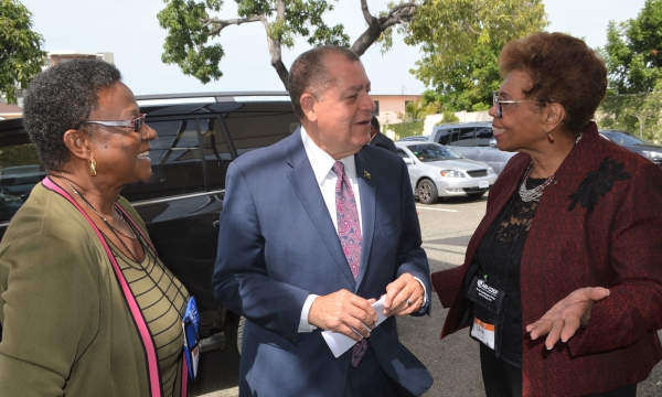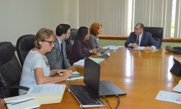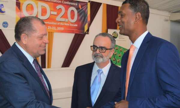 Regional Vice-President for Latin America and the Caribbean (LAC), Europe and Central Asia (ECA), Ms Georgina Baker (left), presents Minister of Industry, Commerce, Agriculture and Fisheries, Hon. Audley Shaw (centre), with a gift during a meeting at the Ministry’s New Kingston offices on Tuesday, May 21, 2019. Looking on is Minister without Portfolio in the Ministry, Hon. J.C. Hutchinson. Among the matters discussed was assistance with priority crops identified for expansion such as coconuts, mangoes, coffee, cocoa, ginger and Scotch bonnet pepper.