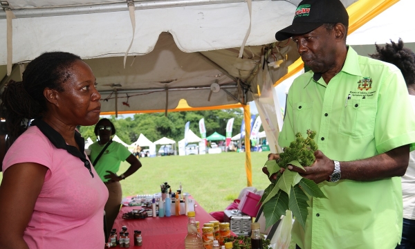 Hon J.C. Hutchinson, Minister without Portfolio in the Ministry of Industry, Commerce, Agriculture and Fisheries, discusses castor beans with Madge Corniffe, owner of Gestan Hills Nature’s Beauty & Delight manufacturers of castor oil and coconut oil, at the 4th staging of the Hanover Agricultural Show held in Lucea, Hanover, on May 25.