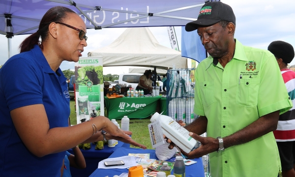 Georgina Robinson, marketing coordinator at AG-CHEM Plant Limited, introduces the Hon J.C. Hutchinson, Minister without Portfolio in the Ministry of Industry, Commerce, Agriculture and Fisheries, to BotaniGard, one of the products being marketed by the company that was on display at the 4th staging of the Hanover Agricultural Show in Lucea, Hanover, on May 25. BotaniGard is a biological insecticide which is said to be safe for use with no negative impact on people, pets and plants.