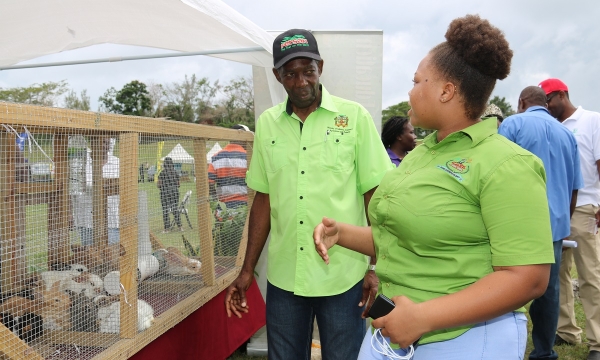 Shashel Ricketts, student pursuing course in General Agriculture at the College of Agriculture, Science and Education, discusses the rearing of rabbits with the Hon. J.C. Hutchinson, Minister without Portfolio in the Ministry of Industry, Commerce, Agriculture and Fisheries, during a tour of displays at the 4th staging of the Hanover Agricultural Show in Lucea, Hanover, on May 25.