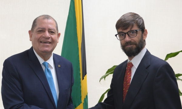 Minister of Industry Commerce, Agriculture and Fisheries, Hon. Audley Shaw (2nd right), in discussion with (from left) Acting Chief Technical Director in the Ministry, Monique Gibbs; Deputy Head of Mission, Argentina, Patricio Uruena Palacio; Ambassador of Argentina, H.E. Luis Del Solar; and Chief Veterinary Officer in the Ministry, Dr. Osbil Watson, during a courtesy call at the Ministry’s New Kingston offices on Tuesday, July 2, 2019. Matters discussed included the strengthening of technical cooperation and the possibilities for expanding trade between Jamaica and Argentina.