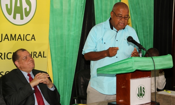 Industry, Commerce, Agriculture and Fisheries Minister, Hon. Audley Shaw (right) listens to a point made by Trade and Markets Officer of the Food and Agriculture Organization (FAO), Juan Cheaz, at a Jamaica Agricultural Society press conference, held at its offices in downtown Kingston on September 11.