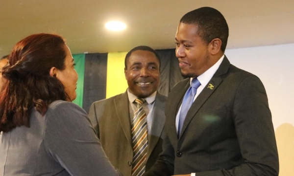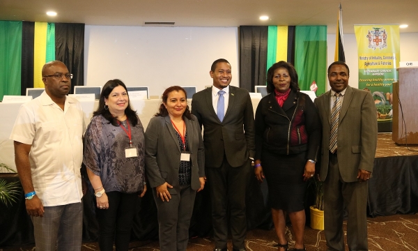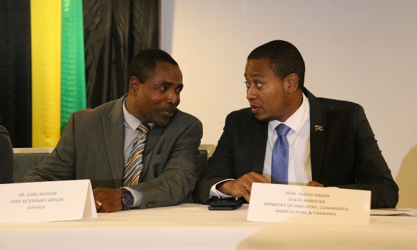 State Minister in the Ministry of Industry, Commerce, Agriculture and Fisheries, Hon. Floyd Green (right), is being introduced to World Organization of Animal Health Regional Representative Dr. Catya Martinez (left), by Chief Veterinary Officer in the Ministry and World Organisation of Animal Health delegate for Jamaica, Dr. Osbil Watson. Occasion was the opening of the 25th Seminar on Harmonization of Registration and Control of Veterinary Medicines Americas Committee on Veterinary Medicines (CAMEVET), at the Royalton White Sands Hotel in Trelawny on September 23.