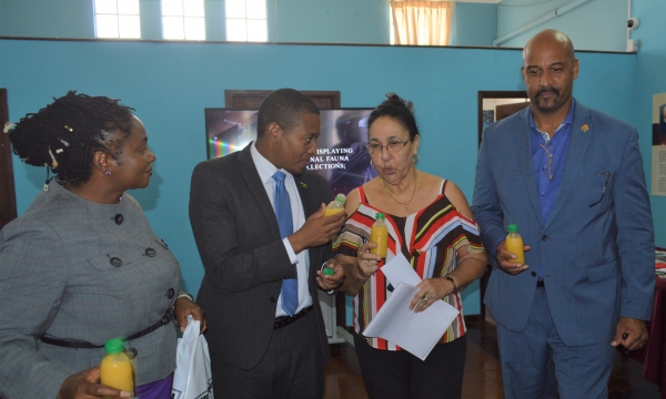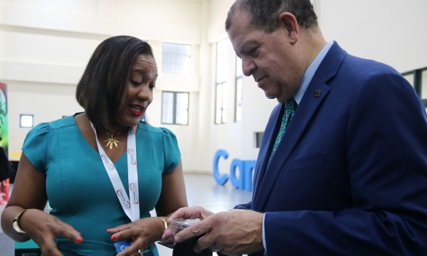 From left, Industry, Commerce, Agriculture and Fisheries Minister, Hon Audley Shaw, Minister of Finance and the Public Service, Dr. the Hon. Nigel Clarke, and Director General of the Planning Institute of Jamaica (PIOJ), Dr. Wayne Henry, in dialogue at the Presentation of the Report on the Jamaica Survey of Establishments 2018, held at the AC Hotel in Kingston on September 25, 2019. At right is James Stewart, Senior Director, PIOJ.