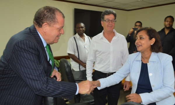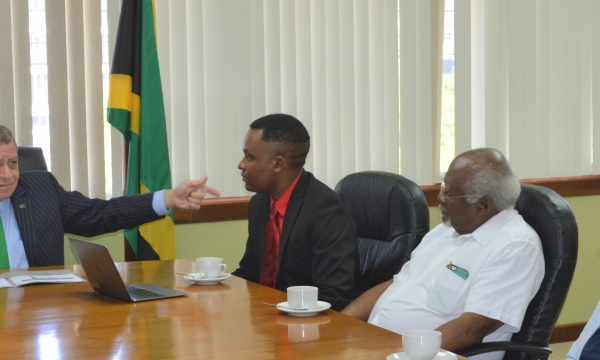 Hon. Floyd Green (3rd left), Minister of State in the Ministry of Industry, Commerce, Agriculture and Fisheries, shares a light moment with (from left) Peter Thompson, CEO, Nigel Myrie, Chairman, both of the Rural Agricultural Development Authority, and Dr. Carl Larsen, Executive Secretary, Global Forum for Rural Advisory Services (GFRAS) at the opening ceremony of the 10th GFRAS Annual Meeting in Negril, Jamaica, on October 1, 2019.