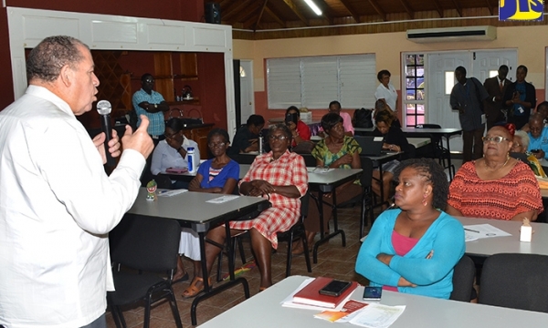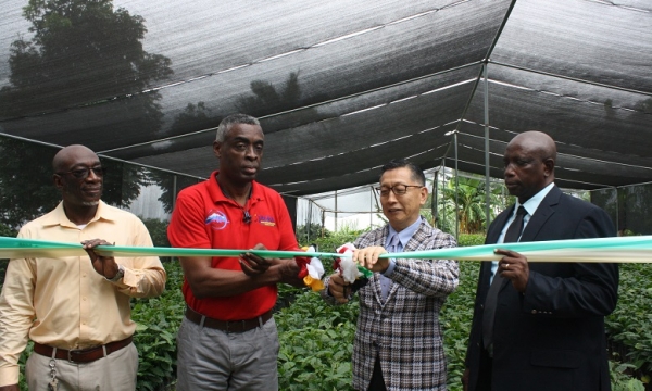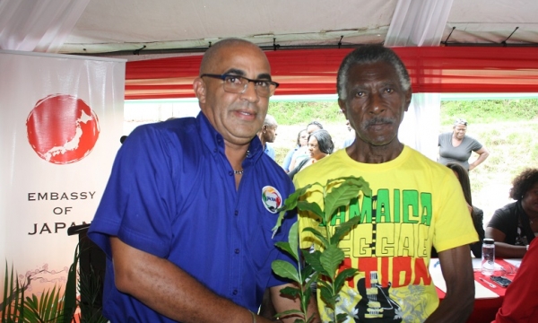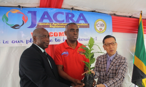 Chief Planning Analyst in the Ministry of Industry, Commerce, Agriculture and Fisheries, Karl Hyatt (second left) looks on as Japanese Ambassador to Jamaica, His Excellency Hiromasa Yamazaki (right), makes a point at a handover ceremony of coffee seedlings to farmers, at Ueshima Coffee Company Limited in Rose Hill, Woodford, St. Andrew on October 4. Others from left listening in are Acting Director General of the Jamaica Agricultural Commodities Regulatory Authority (JACRA), Gusland McCook and Councillor of the Gordon Town Division in East Rural St. Andrew, Neville Whittaker.