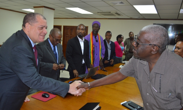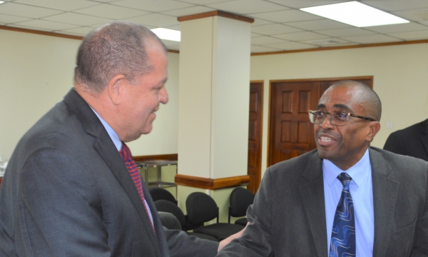 Minister of Industry, Commerce, Agriculture and Fisheries, Hon. Audley Shaw (3rd left), along with (from left) Chief Technical Director for Special Projects for the Agriculture Portfolio, Roy McNeil; Chief Technical Director for the Industry Portfolio Monique Gibbs; Chief Executive Officer, Caribbean Catastrophe Risk Insurance Facility Segregated Portfolio Company (CCRIF SPC), Isaac Anthony; Chief Risk Management Officer, CCRIF SPC, Dr. Michael Spranger; Dr. Mario Ordaz Schroeder, Risk Management Team, CCRIF SPC; and International Trade Specialist in the Ministry, Dennis Crawford, during a...
