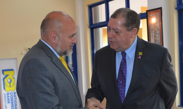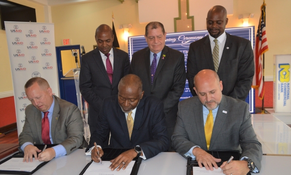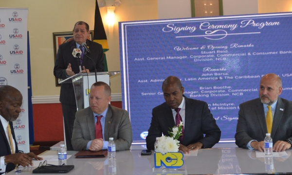 Minister of Industry, Commerce, Agriculture and Fisheries, Hon. Audley Shaw, speaking at the official signing ceremony between the United States Agency for International Development (USAID) and the National Commercial Bank of Jamaica (NCB), at the NCB Wellness and Recreational Centre, Phoenix Avenue, Kingston, on Thursday, October 31, 2019. Seated (from left) are Assistant General Manager, NCB, Stuart Reid; Deputy Chief of Mission, United States Embassy, John. W. McIntyre; Senior General Manager, NCB, Brian Boothe; and Assistant Administrator for the Latin America and the Caribbean Bureau...