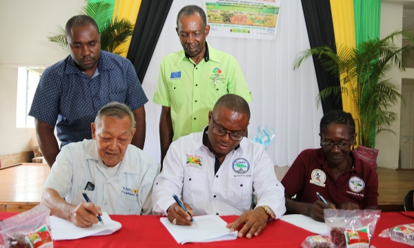From right, Alfred Tenn, farmer, Damion Young, CEO, Home Grown Produce, and Mellody Garwood, Coordinator, Top Burnt Ground Women Farmers Group, sign contract for production of red peas at the launch of the Home Grown Produce Red Peas Project on November 1, 2019 in Spalding, Clarendon. The project is aimed at increasing the production of red peas in Jamaica. Witnessing the proceedings are (from left) Alexi Reid, Chief Agronomist, and Hon. J.C. Hutchinson, Minister without Portfolio, both at the Ministry of Industry, Commerce, Agriculture and Fisheries.