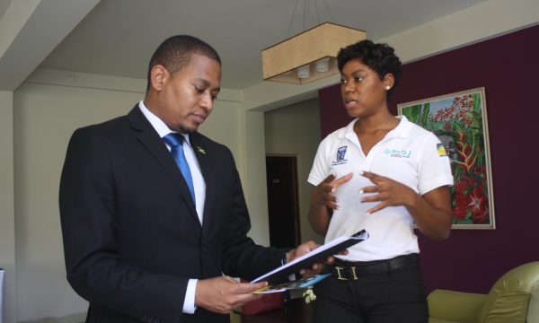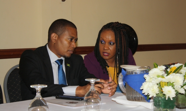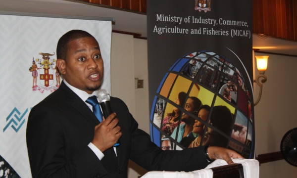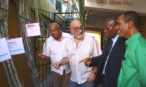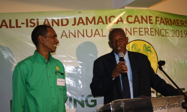 Senior Director in the Strategic Planning Division of the Ministry of Industry, Commerce, Agriculture and Fisheries, Delroy Coley (second right) makes a point about the variety of sugarcane available, at the Annual General Meeting of the All-Island Jamaica Cane Farmers Association (AIJCFA), held Wednesday, November 13 at the Denbigh Showgrounds in Clarendon. Others from left are, President of the Jamaica Agricultural Society, Lenworth Fulton, Immediate Past Chairman of the AIJCFA, Allan Rickards and Manager of the AIJCFA, Nigel Myrie.