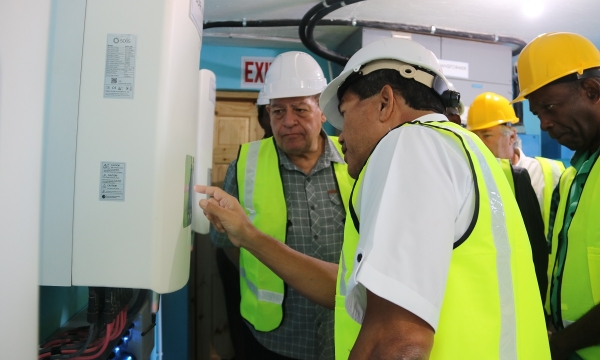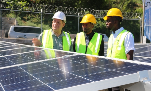 Lorraine Geddes-McDonald, Commercial Manager at the National Irrigation Commission (NIC), presents a picture of the solar-powered Bengal Pump Station to (from left) Hon J.C. Hutchinson, Minister without Portfolio, Hon Audley Shaw, Minister, both of the Ministry of Industry, Commerce, Agriculture and Fisheries, and Senator Aubyn Hill, Chairman, NIC. The occasion was the commissioning of the 320 panel pump station in Trelawny on January 23, 2020.