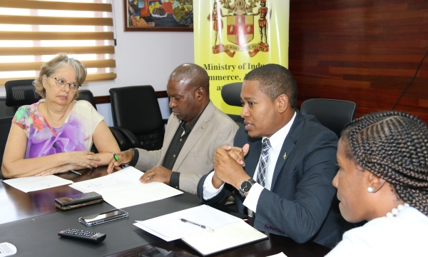Dunstan Whittingham, President of the Jamaica Vendors, Higglers and Markets Association, speaking at a COVID-19 consultation meeting with industry stakeholders on March 5, 2020, held at the Ministry of Industry, Commerce, Agriculture and Fisheries ’ Hope Gardens offices in St. Andrew on March 5, 2020. Others from left are Damion Rowe of the Plant Quarantine and Produce Inspection Branch, Imega Breese McNab, Executive Director, and Richard Pandohie, President, both of the Jamaica Manufacturers and Exporters Association. Issues discussed at the meeting, included the availability of supplies...