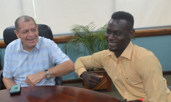 Minister of Industry, Commerce, Agriculture and Fisheries, Hon. Audley Shaw (left), and State Minister in the Ministry, Hon. Floyd Green (right), greet cattle farmer of Colley Mountain, Manchester, and recipient of the Prime Minister's Award for Agriculture, Okeito Thompson, during a courtesy call at the Ministry’s New Kingston offices on Thursday, May 21, 2020. Among the matters discussed at the meeting was access to farm lands. Ministers Shaw and Green explored the possibility of accessing mined lands that could be used for cattle rearing and other farming activities.
