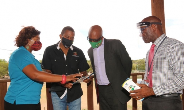 Newly appointed Minister without Portfolio in the Ministry of Industry, Commerce, Agriculture and Fisheries (MICAF), Hon. Leslie Campbell (second right), is being shown a brochure by Project Manager of the Promoting Community-based Climate Resilience in the Fisheries Sector project, Selena Ledgister (left), at the launch of the project and sensitization meeting in Treasure Beach, St. Elizabeth, on July 27. Others from second left are: Member of Parliament for St. Elizabeth South West and Minister of State in the Ministry, Hon. Floyd Green, and Project Development Specialist in the Ministry...