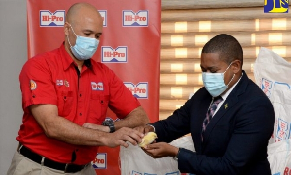 Minister of Agriculture and Fisheries, Hon. Floyd Green (right), pets a chick handed to him by Vice President, Hi-Pro Division, Jamaica Broilers Group of Companies, Colonel Jaimie Ogilvie (ret’d) during the handover of input supplies to farmers at the Jamaica Broilers Limited headquarters in McCook’s Pen, St. Catherine, on December 16. The company donated 20,000 baby chicks and 1,000 bags of broiler ration to farmers who were affected by flood damage.