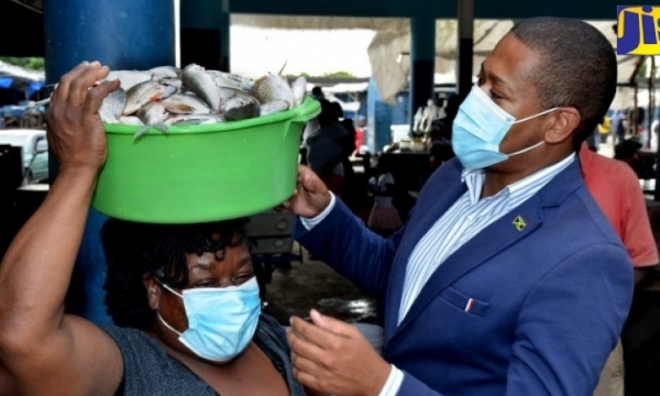 Minister of Agriculture and Fisheries, Hon. Floyd Green (right), in discussion with fish vendor at the Old Harbour Bay fishing beach in St. Catherine, Joan Bailey, during a recent tour of the facility.