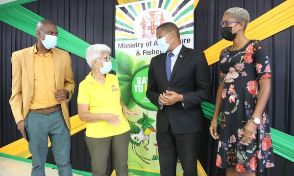 Agriculture and Fisheries Minister, Floyd Green (2nd right), in dialogue with Rita Hylton (2nd left), director , Jamaica Manufacturers and Exporters Association; at the virtual launch of the Agriculture Trade Enforcement Advisory Mechanism (ATEAM) on September 2. Others from left are Dennis Crawford, International Trade Specialist at the Ministry; and Kelli-Dawn Hamilton, JAMPRO.