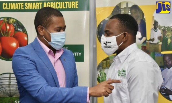 Minister of Agriculture and Fisheries, Hon. Floyd Green (left), speaking with youth farmer Venroy Wint at the launch of the Youth in Agriculture Roadmap at the Ministry in Kingston, on Thursday (November 12).