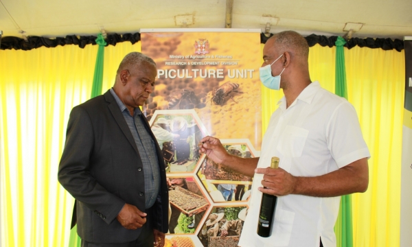 Minister of State in the Ministry of Agriculture and Fisheries, Franklin Witter (left), views a sample of Varroa Mites shown by Hugh Smith, Chief Plant Protection Officer, Apiculture Unit, Research & Development Division in the Ministry of Agriculture and Fisheries. Varroa Mites are parasites that attack adult honey bees and honey bee brood, weakening and destroying the bee colony. The occasion was the World Bee Day celebrations held at the Ministry’s Hope Gardens Complex on Friday, May 20, 2022.