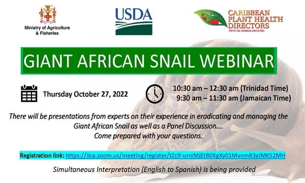 The Ministry of Agriculture & Fisheries (Plant Quarantine/Produce Inspection Branch) in association with United States Department of Agriculture and Caribbean Plant Health Directors Forum this Thursday, October 27, 2022 at 9:30am to discuss the Giant African...