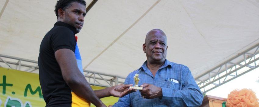 Minister of State in the Ministry of Agriculture and Fisheries, Franklin Witter (right), presents the Champion Graded Buck Trophy to livestock farmer, Frank Surgbally, at the St Mary Agri-Expo on Monday, April 18, 2022. Over seven farmers were awarded prizes for the rearing of quality livestock animals during the show.