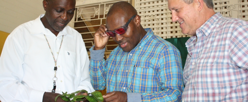 Interim Chief Executive Officer of the National Fisheries Authority, Courtney Cole (centre) ,examines a citrus plant affected by the Citrus Greening disease with specialized glasses at the 21st annual general meeting of the Jamaica Citrus Protection Agency (JCPA), at the Bybrook Sporting Facility in Bog Walk, St. Catherine, on February 5. Others from left are Plant Quarantine Officer in the Ministry of Industry, Commerce, Agriculture and Fisheries, Alfred Barrett, and Chairman of the JCPA, Peter McConnell.